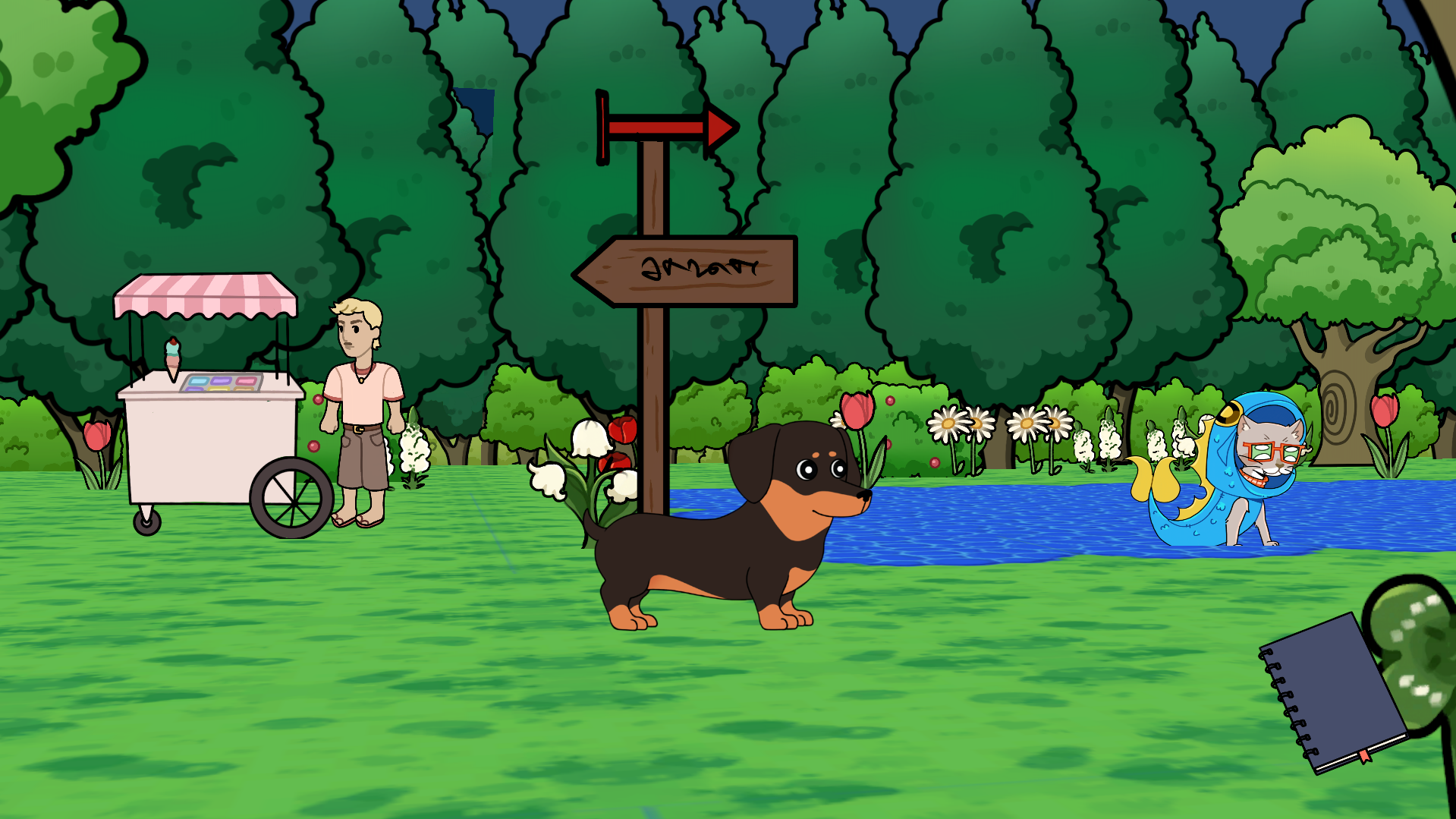 Maca, la gata pez con capacidad pulmonar ha perdido de vista a su dueño. Entrevista a los diferentes humanos del pueblo para ver si alguno ha visto a Rubén!